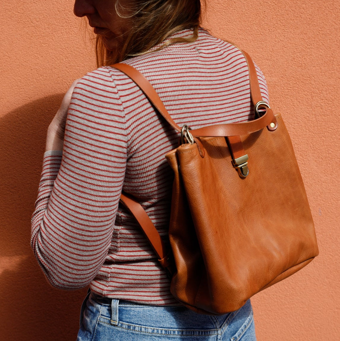 Our convertible Bucket Backpack Tote is two bags in one. This bag is adjustable and converts from a backpack into a crossbody purse with the pull of a strap. This bag is lined with canvas, which can we turned inside out for easy spot cleaning.
